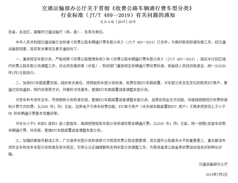 中華人民共和國交通運輸行業(yè)標(biāo)準(zhǔn)《收費公路車輛通行費車型分類》(JT/T 489—2019)已發(fā)布,落實本行政區(qū)域內(nèi)收費公路車型分類調(diào)整工作,并會同發(fā)展改革(價格)、財政部門重新核定車輛通行費收費標(biāo)準(zhǔn),報省級人民政府批準(zhǔn)后,統(tǒng)一從2020 年1月1日起執(zhí)行。
