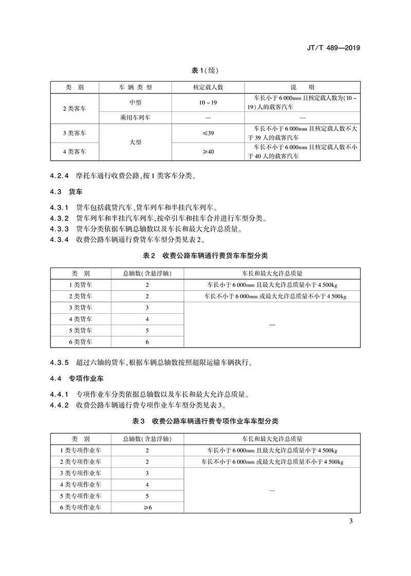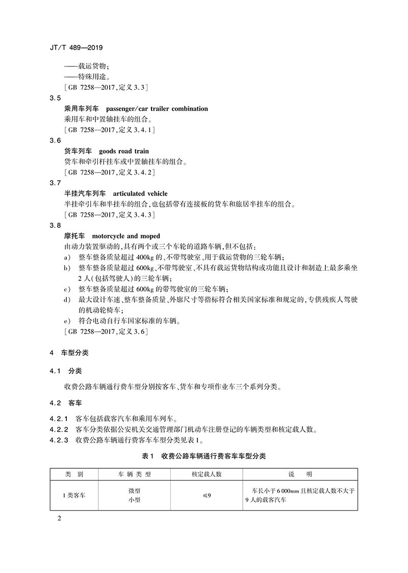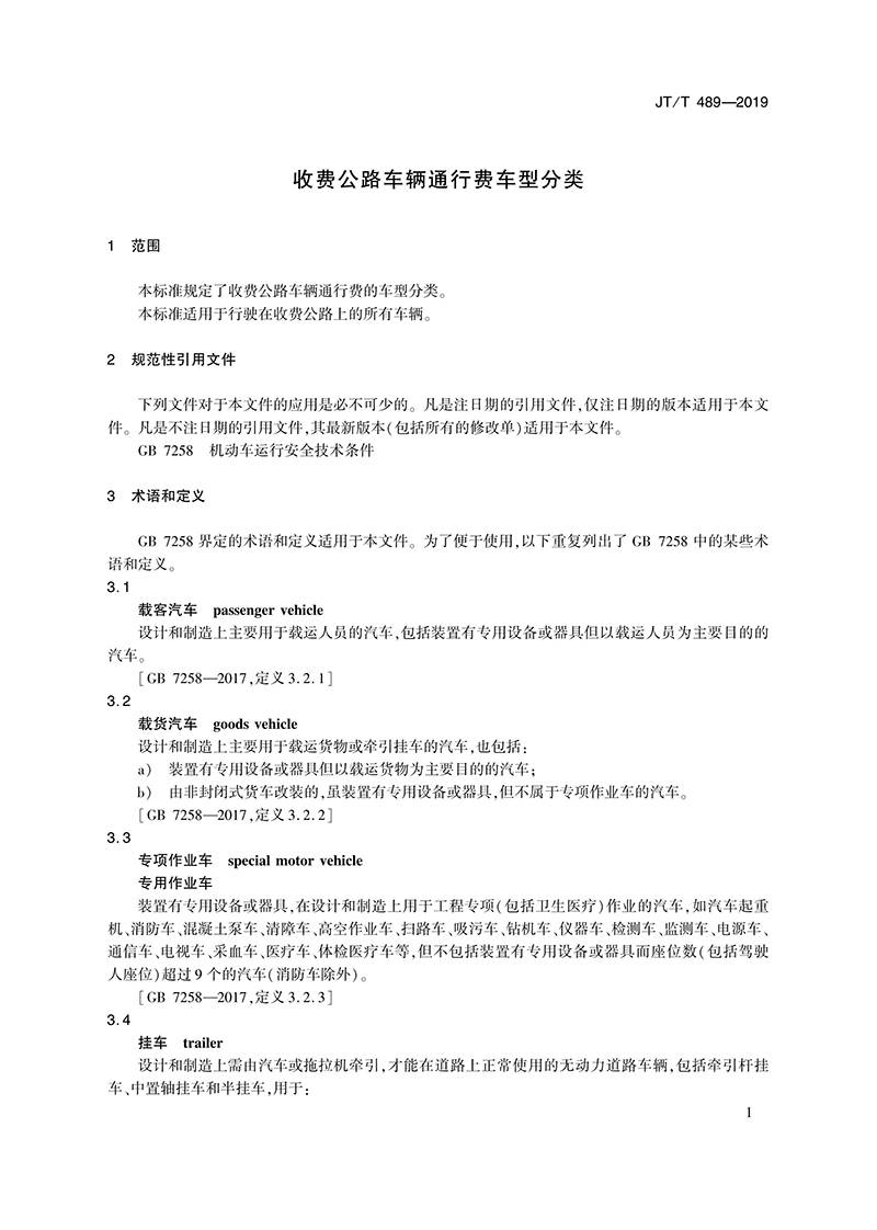 交通運輸行業(yè)標(biāo)準(zhǔn)《收費公路車輛通行費車型分類》 JT/T 489-2019