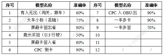 (四)稽核模型建立與準確率驗證本文所述AI稽核系統(tǒng)根據(jù)不同逃費類型建立對應(yīng)模型,目前已實現(xiàn)大車小標、有入無出、屏蔽卡簽入省、屏蔽卡簽出省、跑長買短、CPC倒卡、CPC入OBU出、一車多卡、一車多簽等近10種偷逃費行為稽核。以大車小標偷逃費行為進行舉例說明。改變車型(車種):大車小標是指發(fā)行車型跟實際車型不符。通過非法手段辦理或套取使用與實際車型不符的車輛標簽,達到偷逃費的目的?;藬?shù)據(jù)驗證方式如下:(1)通過交易數(shù)據(jù)中的車牌、車牌顏色和車型與發(fā)行數(shù)據(jù)對比,確定大車小標;(2)利用入口稱重數(shù)據(jù),在收費數(shù)據(jù)中的入口交易數(shù)據(jù)搜索軸數(shù)與車型不符的車輛;(3)搜索收費數(shù)據(jù)中的入口交易數(shù)據(jù),車型為一型貨車,且車牌顏色為黃色的車輛;(4)篩選車輛通過ETC專道和人工車道的收費車型存在不一致的情況,通過車牌號篩選某個車牌多次出現(xiàn)兩個及以上的車型的車輛;(5)對篩選出的車輛,根據(jù)大數(shù)據(jù)平臺圖片、交易數(shù)據(jù),對特征點進行對比分析,形成初步結(jié)論。通過對稽核模型分析數(shù)據(jù)與稽核人員核實數(shù)據(jù)對比分析,進行稽核模型分析篩查準確率驗證,稽核模型準確率如表2所示。屏蔽卡簽、倒卡通行介質(zhì)等稽核模型準確率較高,達90%,有入無出(闖關(guān)、跟車)、跑長買短(U/J行駛)因系統(tǒng)及計費規(guī)則、現(xiàn)場管理和證據(jù)獲取等多重因素影響,準確率為50%~60%左右,但能夠滿足稽核業(yè)務(wù)需求?;四P蜏蚀_率如表2所示。